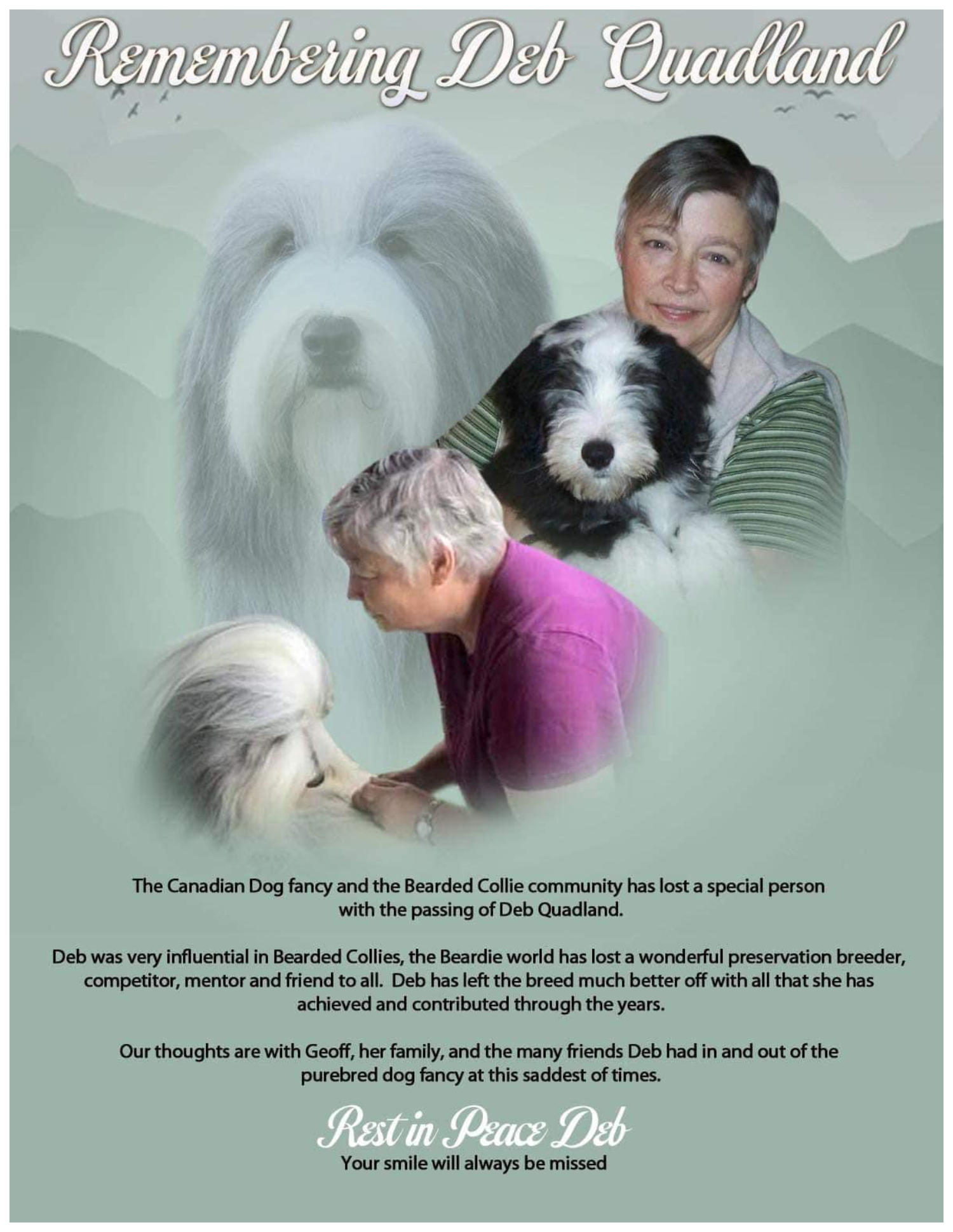 missed by her many close friends in the Bearded Collie and Arabian horse worlds, from work (at